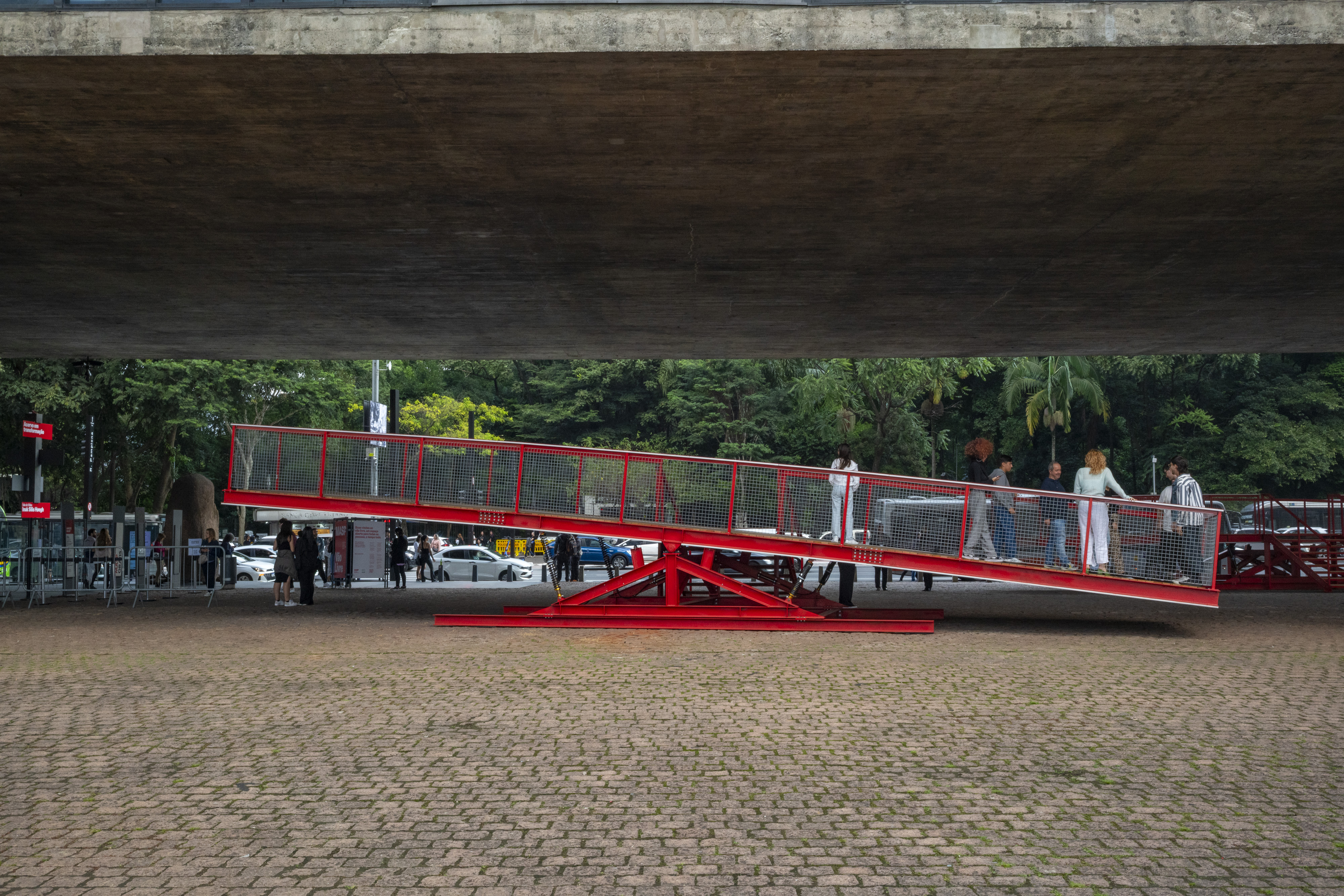 O vão livre de 74 metros de extensão foi projetado pela arquiteta Lina Bo Bardi como uma praça cívica, um local de encontro e convivência destinado a manifestações culturais diversas, como dança, teatro, música e circo, além de exposições interativas e didáticas. O trabalho de Iván Argote (Bogotá, Colômbia, 1983) reforça a vocação do espaço ao propor uma instalação interativa composta por duas plataformas móveis dispostas nas extremidades do vão, transformando-o em um campo de experimentação sensorial e social.